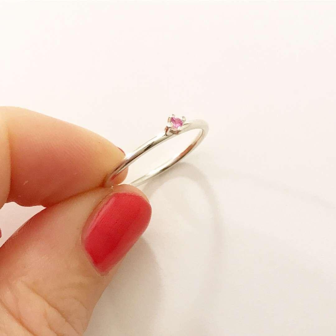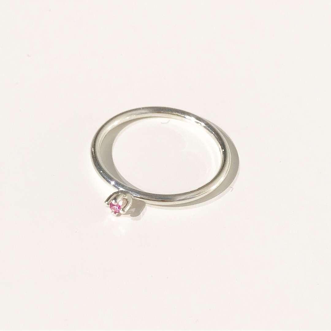 Tunn och petit är Petite namnring med rosa safir. Du kan välja rund eller platt skena. Trots den tunna skenan kan du få ditt eget budskap graverat på den. Kanske barnens namn eller din älsklings? Välj om du vill ha text utanpå eller i eller bara ha den helt ren.